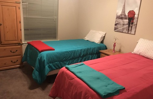 Very clean, pretty & cozy home located on the west side of town. The entire two story house is available to guests. Upstairs has two bedrooms, one with a full size bed and the second one with two twin beds. One jack-and-Jill full bathroom. Downstairs there is one bedroom with a queen size bed, a full bathroom with access from bedroom and hallway. One very cozy living room with a big screen TV, basic cable and internet. A kitchen with dishes, utensils and pots & pans with a small table. One double garage. Washer and dryer in garage.