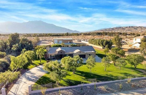 This gorgeous modern hacienda home has beautifully landscaped 2 acre grounds with Mountain Views. If anyone in your group loves sports, there is plenty of grassy areas for soccer, volleyball & basketball (nets & balls are provide). This spacious home features 5 bedrooms with 8 beds. It is also centrally located between Palm Springs, Indio and Palm Desert without the noise and busyness of the city & yet within 3 miles to Walmart & Costco & minutes to all the dining at El Paseo. RVC # 61-198