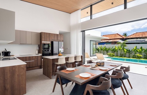 The villa features three spacious bedrooms and 3.5 modern bathrooms, ensuring comfort for families, friends, or couples looking for an unforgettable stay. A large living area and elegant dining space provide ample room to unwind, while the fully equipped kitchen allows you to prepare meals effortlessly.