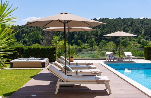 The outdoor area offers a private, heated swimming pool 4m x 12m with massage, a Jacuzzi, 8 deck chairs, and 3 sun umbrellas, outdoor shower, covered outdoor dining area with barbecue. Next to the dining area is a plot with artificial grass plot with toys and playing area for your youngest.