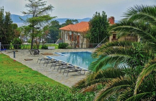 Villa Alba Chiara is a beautiful 250 m2 two-storey traditional stone villa in Chalkidiki, Greece, 7 km from the Holy Mount of Athos gate, with a monastic architecture, a panoramic sea view in front of the Ammouliani island, a unique 90 m2 private swimming pool, immersed in flowers, pines, olive, lemon and orange trees, in a 15.000 m2 estate.