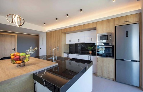 Moving further inside, three elegant and spacious bedrooms promise restful nights and peaceful moments. The two master bedrooms feature plush double beds, large wardrobes for effortless organization, and 43-inch smart TVs for entertainment. The large balcony doors open to spectacular views of the mountains and sea, while the en suite bathrooms with walk-in showers provide the ultimate comfort and privacy. The third bedroom also offers a cozy double bed, a wardrobe, and a 43-inch smart TV, while a skylight fills the room with soft natural light, creating a serene and airy atmosphere.All areas are equipped with air conditioning and wireless internet.