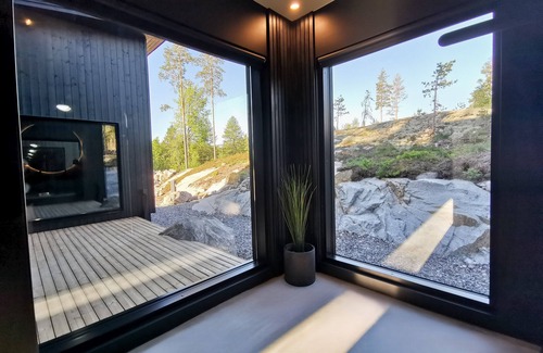 Sisustus on moderni ja tunnelmallinen. Väripaletti on tumma ja villassa on käytetty laadukkaita materiaaleja. Jokaisessa huoneessa on isot ikkunat luontonäkymillä.