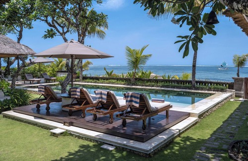 You can’t find a better location in Sanur than Villa Cemara! This multi-pavilion Bali-style villa is spread across 60 metres of absolute beachfront land, with direct beach access and fantastic sea views from the open-sided living pavilion, large master suite, and all four ensuite guest bedrooms. Sunbathe on the deck, cool off in the 10-metre pool, siesta in the raised beachside bale, build castles in the golden sand mere metres away. Enjoy the attentions of the dedicated staff, happy to whip up gourmet meals, mix cocktails, and see to your every whim. Isn’t that just perfect!