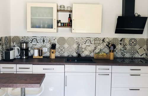 A friendly bedroom and a guest toilet with shower are available on the ground floor.