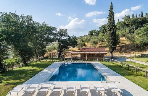 Villa Evarne is an elegant and welcoming two-story villa surrounded by the greenery. It sleeps ten people. From Villa Evarne you will enjoy a broad view of the greenery and of the surrounding countryside. Villa Evarne is 200 square meters (2150 square feet). It features a private swimming pool, a private garden, air conditioning (please read description below to check in which rooms the units are installed), winter heating and WI-FI Internet access.