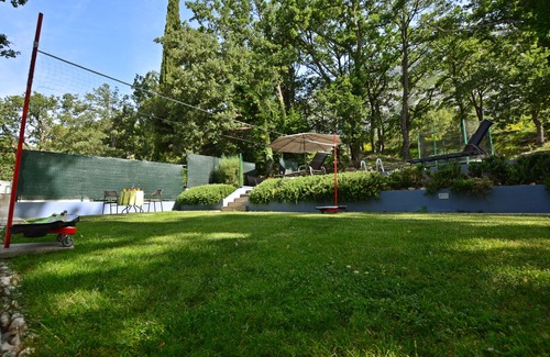This comfortable holiday home is situated in a small village Gata, near the coast of Adriatic sea. It's located on the slopes of mountain Mosor and surrounded with the forest that has many signposted trails. It's perfect for everyone that loves nature and enjoys a peaceful and quiet vacation. The nearest city is Omiš, a beautiful little town with many beaches and endless possibilities for different summer activities such as rafting, fishing, hiking, sightseeing and cultural events. House itself has three floors. The ground floor has two garages and a small gym with table tennis. On the first floor there are kitchen, dining room, living room and a small bathroom. On the second floor, there are three bedrooms and a big bathroom. There is air-conditioning downstairs and in each bedroom. House has a small balcony and a big balcony with a dining table. Behind the house, under the trees that provide sun protection is a swimming pool and Lazy-Z-Spa jacuzzi. Next to the pool is bbq, dining table and sun loungers. There is also a small playground for kids that has swings and a big trampoline.