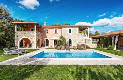 Located in the small village of Pifari near Žminj, luxury villa Gimino offers an exclusive retreat with a private heated pool, surrounded by a lush garden with olive trees and other Mediterranean plants.