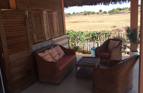 In the heart of a beautiful property of 2000 square meters, air-conditioned villa ideal for couples. Calm and bucolic site with sea view, 5 minutes from the magnificent coconut palm beach, 10 minutes from shops and the tourist area of Ambatoloaka.