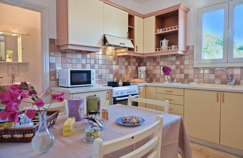 Villa Ireni sleeps 6 and has 3 light and airy bedrooms; one with a garden view and two single beds, one with sea view and two single beds and one with a double size bed with a sea view. Each room has its own air-conditioning unit, two double windows and is tastefully furnished with comfortable and traditional furniture. Wooden ceilings and framed artwork by the owner add to the uniqueness and beauty of the villa.