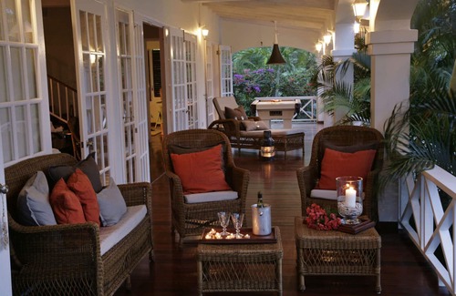 The house – designed and built by island-renowned architect Wayne Brown – incorporates traditional Caribbean style with wooden floors, a house-length veranda, jalousie shutters, wooden railings, and wood-carving-detailed balcony, while having a distinctly contemporary feel. French doors run the front length of the house and open onto the veranda and onto the spacious pool deck and infinity pool, creating an expansive indoor-outdoor common area. This space is designed with purpose in mind with ample comfy outdoor seating, billiards table & outdoor dining space perfect for enjoying the weather. The house is beautifully furnished and decorated in a Caribbean-colonial style, with four-poster beds, planter chairs, wicker chairs and tables, and sea turtle shells.