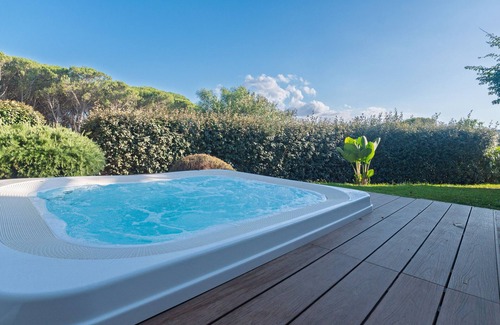 Outside, you can relax in the private garden and enjoy the panoramic hot tub with beautiful views of the sea and mountains. The villa has both covered and uncovered terraces, as well as a balcony, offering various outdoor spaces to relax and admire the scenery.