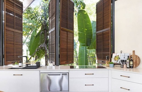 A well-appointed granny flat provides a peaceful retreat with a queen-size bed and a double sofa bed that sleeps one adult or two children. It is furnished with a two-seater table, a kitchenette, and open air bathroom allowing for complete privacy and convenience, while leafy views out to the backyard make this space feel like a blissful sanctuary.