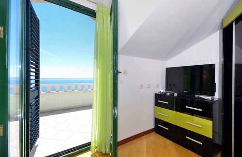 Dalmatian villa with pool and sea view, panoramic view of the Dalmatian islands of Brac and Hvar.Villa Marina has four separate bedrooms with double beds, as well as a bedroom with a single bed. There are four bathrooms. In total, up to 10 people can stay in Villa Marina.The villa has a large terrace with a private heated pool of 60m², a covered seating area and grill, high-quality garden furniture, loungers and parasols.The living space is 264m² and all areas are fully air-conditioned.A closed garage for several cars as well as outdoor parking spaces on the property are reserved exclusively for guests.On the ground floor of the house there is a spacious living room with a fireplace, a fully equipped kitchen, the dining area, two bathrooms with shower and toilet and a washing machine. You will also find two bedrooms with double beds on the ground floor, as well as the exit to the terrace.On the 1st floor there are three bedrooms (two with double beds, one with a single bed), a bathroom with shower and toilet, as well as the large terrace with a stunning sea view.In the basement there is a fitness room with a treadmill, various training equipment, toys for the children. The konoba in the basement contains a fully equipped kitchen, as well as seating for 20 people, a private fireplace that can also be used as a grill. There is also a bathroom with shower and toilet here.Bed linen, hand and bath towels as well as pool towels are provided.Villa Marina is built on a 3000m² plot, and is approx. 1.4km from the old town of Makarska. The garden is huge, beautifully landscaped with Mediterranean plants, vines, olive trees and palms, the property is surrounded by cascade-like walls, and offers privacy.Pets are welcome (max. 3 dogs, up to max. 25kg weight)