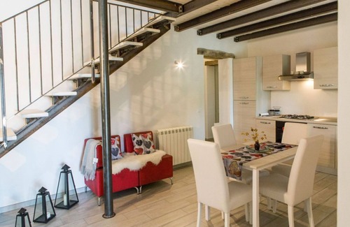 - 1st apartment: Furnished in a contemporary style, it is set on 2 levels (ground floor and mezzanine). On the ground floor there is a cozy living area, furnished with: sofa bed, dining table for 4 people, tv and a small equipped kitchen. Following is a bathroom with shower, and a double bedroom with direct access to the private pergola. On the mezzanine floor there is a French bed. Moreover this apartment boasts a comfortable private veranda, equipped with a sofa and chairs.