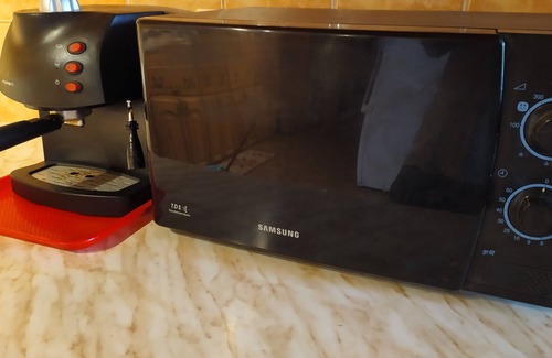 The kitchen has an gas oven, a toaster, a coffee maker, a frigiderefreezer and a microwave.