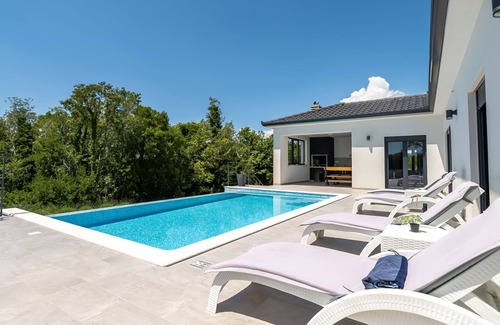 Beautiful single-family house "Villa Riki". In the hamlet Vlakovo 12 km from the centre of Labin, in a sunny position, 3 km from the sea, 3 km from the beach. Private: property 3'000 m2 with lawn and wildlife garden, swimming pool angular (8 x 4 m, depth 150 cm, seasonal availability: 26.Apr. - 05.Oct.) with internal staircase. Outdoor shower, terrace, barbecue, pool maintenance by the owner/gardener. In the house: internet access. Parking (for 2 cars) at the house on the premises. Shop 4.5 km, supermarket 12 km, restaurant 4.5 km, bus stop 14.6 km, pebble beach 3 km. Please note: airfield 55 km from the property.