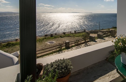 Built in the traditional cycladic architectural style with the seashore just steps away, the villa offers great view to the whole bay that lies in front. From the mountains of Ikaria island where the sun rises, to cosmopolitan Mykonos, Delos, Rineia and all the way to the distant island of Paros, the unobstructed horizon view, lines up the eye and the mind to an almost meditative state. Natural light penetrates the house throughout the morning, while later in the evening, the afternoon breeze cools down the heat of the day. Two of the apartments (36+52 sq.m) are situated in the upper level of the building. All windows offer magnificent view of the sea and the surrounding islands that can be seen from any place inside the house. The two private balconies, like a captain’s bridge on a sailing ship, give you a sense of floating above the silvering blue. There you can enjoy your morning coffee, an afternoon nap or lose track of time while absorbing the lines of your favorite book. Entering the house, simple lines and minimal touches describe the furniture and the decoration. Traditional wooden ceilings and colorful wall frames add to the warm sense of the place. Be it a sofa, an armchair or your pillow underneath a sea breezed window, there is always a good reason for a short midday siesta.