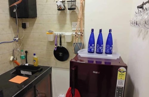 - A fully equipped modern functional kitchen with all basic essentials and electricals. The modern kitchen is eqipped with a refrigerator, microwave oven, an induction stove, a hot plate, toaster, tea/coffee pot and a modern latest hi-tech water filter. Also stashed with all cutlery, crockery, silver along with a full bar set with stock of whiskey, beer n wine glasses. Cheers !🥂