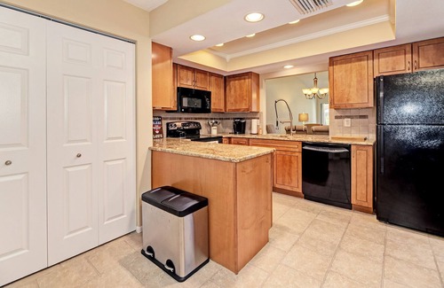 Village des Pins 3645’s dining table seats 6, in plush chairs so comfortable you’ll want to linger long after dessert is over. On the other side of a pass-through is the spacious, fully equipped kitchen. Along with a full array of appliances, pots and pans, and tableware, it features such niceties as a bistro table for 2 and a pullout sprayer faucet. Just off the kitchen, there’s also a full-size washer and dryer, so you don’t have to use a shared laundry room during your stay.