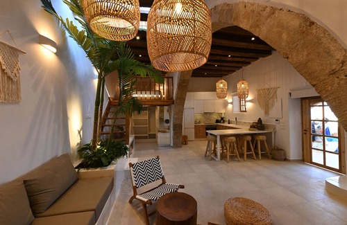 The unique architecture and the classy interior of Casa Carma combines both, tradition and the highest design aspirations. The centrepiece of the house is a large, traditional living room with round arch, fully equipped kitchen, and dining area. In addition, the living area is equipped with two twin beds and an adjacent bathroom. All our guests will sleep in proper beds (no sofa bed) that measure 180 or 90 cm in width. A further master bedroom is furnished with one twin bed and one single bed as well as another ensuite bathroom. Additionally, the accommodation is fully air-conditioned and provides free Wi-Fi.