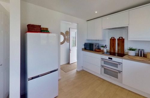 Living/Kitchen/Dining Area- A generous space with huge picture windows to take in the ocean views. The living area has a comfy sofa and chairs, a TV, plus a dining table and chairs. The new kitchen is well-styled and equipped with an electric hob and oven, fridge freezer, dishwasher, microwave and washing machine.