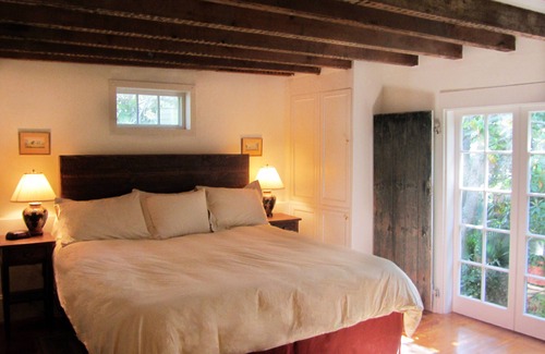 The roomy interiors of the Carriage House have original beamed ceilings, heart-pine floors and a second-floor balcony with a view of Charleston Harbor. Furnishings include attractive antiques as well as comfortable couches and luxury bedding for a restful Charleston stay. With a California king sized bed in the former hayloft, the carriage house is ideal for one couple and can also accommodate a second couple (willing to share the bathroom) with a queen sized sleeper sofa in the large upstairs sitting room.