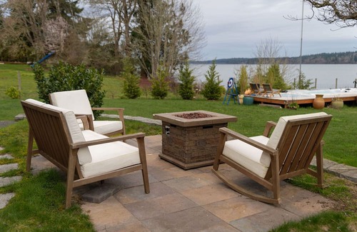 Outside, the large backyard has a playground for kids, a lap pool and outdoor seating with excellent views of the sound, and additional seating around a fire pit perfect cozy evenings under the stars. You’ll also have access to the onsite herb garden.
