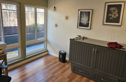 The inside has 3 bedrooms and 2 bathrooms. There is a spacious office that has a desk and monitor available to work from home, as well as a double murphy bed.