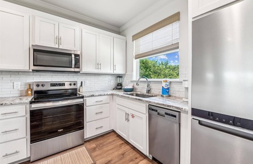 AMENITIES:Multiple smart TV's, beautifully appointed kitchen with quartz countertops and stainless appliances, luxury vinyl plank floors throughout, all new furniture, bedding, decor and accessories, large covered porch, elevator, private pool (heated or cooled for a fee of $450 per week), ground level has one bedroom with 2 queens, full bathroom, game room with pool table, cozy seating and large TV. Pool area extends to under the house entertainment area with a charcoal grill, tables and chairs. Two garage bays available for guest use, One garage bay is not for guest use, Owners boat on premises and not for guest use.