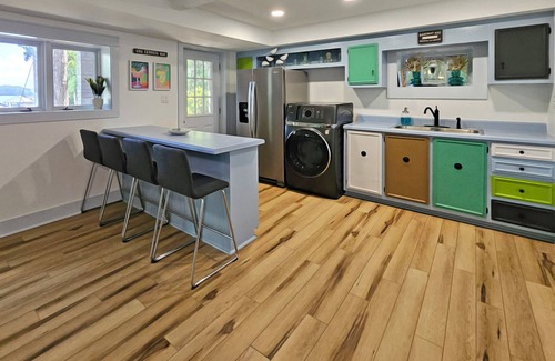 This lakefront home is located very close to Queens Landing in Mooresville. There are 3 paddleboards, 3 kayaks, child and adult lifevests, fishing poles with basic tackle, deck lounges, wonder noodles, floating lounges, as well as some water toys and beach towels available to use during your stay. There are many spaces available to relax and enjoy the lake - my favorite is in a recliner on the screened porch! There is a large table on the screened porch, perfect for enjoying a meal or a card game with the whole family. A couch and fun hanging chairs on the lower porch for sipping a beverage with friends. A picnic table lakeside for eating lunch while fishing and swimming. A set of lounge chairs for the dock for sunbathing. A large lakeside firepit with Adirondack chairs for making s'mores and relaxing late into the evening. The kitchen is fully appointed with dishes, utensils, cookware and small appliances including a blender, drip coffee maker, toaster, crock pot and electric kettle. There are also some cooking basics such as common spices, flour, sugar, oil and coffee. A 36" Blackstone griddle is located on the upstairs deck, close to the kitchen. There are 5 bedrooms in the home. The first has a king bed, desk with desk chair and attached full bath. The second bedroom has a queen bed. The third has a Twin XL. The fourth is a basement bedroom with a queen bed. The fifth is a basement bunk room with 2 twin loft beds and 2 full sized beds. Crib and highchair provided. There is wireless internet available as well as 5 flat screen TV's with Roku, Hulu, Netflix and Disney+ services. There are also books, board games and cards. Two full baths upstairs and a full bath downstairs with walk-in shower. The basement also features a shuffleboard table, kitchenette with a second full sized fridge and laundry facilities. Guests will have full use and access to the entire home and private use of the dock while staying at the House. Comfortable parking for 6 vehicles.