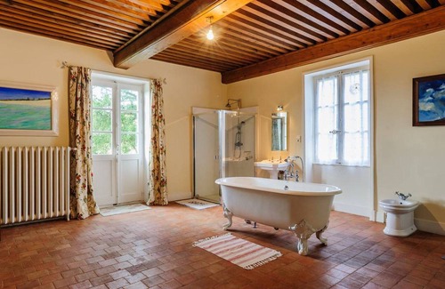 This beautiful small chateau has 9 bedrooms complementing a large kitchen-dining room, dining room, sitting room, and billiards (6') room on the ground floor. The main rooms are all South facing with large windows on the first floor and French doors on the ground floor. Until recently it was our home so you will find it very well equipped: from the Aga in the kitchen to the high speed fibreoptic internet; Jotul and Clearview woodburning stoves; dual purpose Viessmann solar panels that heat the hot water in the house and the swimming pool down to details like French Scrabble and a well stocked herb and spice drawer! The private garden and 11m heated salt-water pool give you panoramic views over vineyards and rolling hills, 150km to Mont Blanc and the Alps on a clear day in the East and the Monts du Tarare in the West.