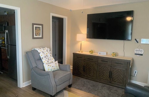 The living room has a super cozy lounger/rocker and a couch that seats 3. The large screen TV is perfect to watch your favorite sports on, or simply binge that series you have been wanting to see.