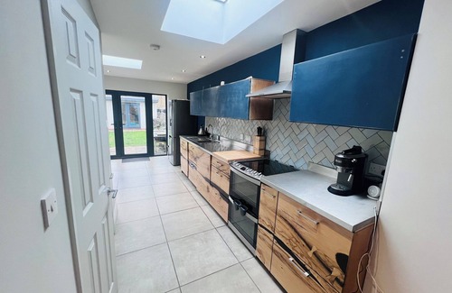 The kitchen is fully equipped with oven, hob, washing machine, dishwasher and fridge-freezer. There is a dining area at the end of the kitchen which has doors that leads out to the garden. The garden has an outdoors table and chairs for alfresco dining.