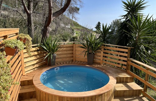 Wooden chalet with private water oasis, immersed in nature surrounded by Mediterranean scrub,