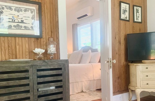 Original BEADBOARD, LEADED GLASS in the FLOOR TO CEILING WINDOWS and CROWN MOLDING... bring on the charm! Plenty of cozy seating including a sofa that that pulls out to a full bed. Watch all your favorite shows on the 42" SMART TV w/ Direct Streaming. There is a cute coffee area with seating, a refrigerator with freezer, microwave and books to read.