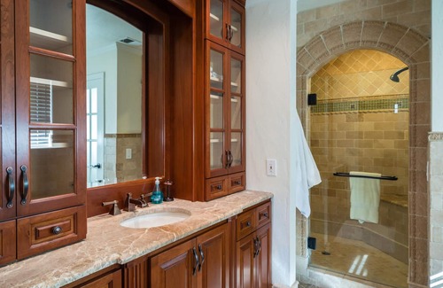 Separate guest house provides a quiet place away from the main house to comfortably accommodate four additional guests with a queen-size pull-down bed and a queen-size sleeper sofa. Detailing includes kitchen with granite counters and stainless steel appliances and a bathroom with a large vanity and over-sized shower. You can relax on the beautiful leather sofa as you watch TV on a large flat screen TV with amazing surround sound or play a game of billiards. Double sliding glass doors step out on to a stone patio with its own fire pit and outside dining.