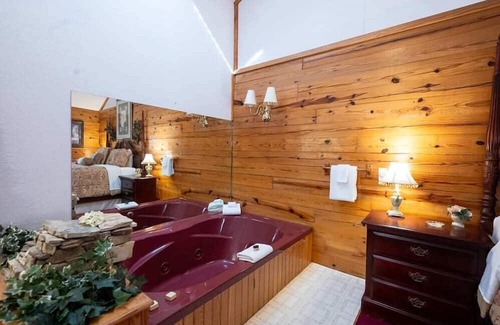 The "Country Rose" is a romantic log cabin furnished with a four poster, cherry wood king size bed, and spa tub for two.