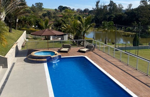 It has 3 bedrooms and 2 bathrooms in house 1 and two bedrooms and 1 bathroom in house 2, full kitchen, party room with barbecue, 2 toilets and pool table, 4x10m pool, cable tv, wifi internet, lake, court of soccer and orchard for visitation. Fantastic!