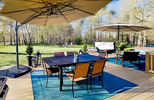The amazing wooded landscape features a sprawling lawn for games and relaxation. Afternoon cookouts are a breeze with a gas grill and alfresco dining on the deck. Rejuvenate with a soak in your private hot tub.