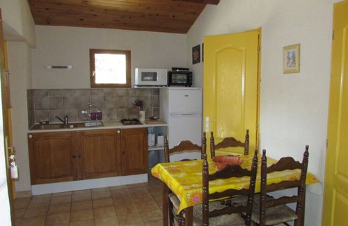 In the peace of apple trees, chalet 2/4 people with terrace and barbecue, shared swimming pool, parking, children's games, wifi access, ideally located for a couple or family vacation, 1 hour from the sea and Spain, at foot of Canigou, hiking on foot or in 4x4, fortified villages, Romanesque art, caves, hot spring, waterfalls, rivers.