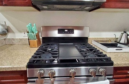 Cozy up by the fireplace in the living area or watch movies on the 75" TV with streaming options provided. We have a fully equipped kitchen that boasts ample storage, a granite counter, and stainless appliances. Perfect for those nights you want to stay and cook.