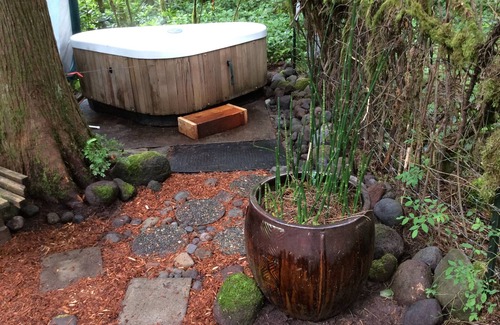 This quaint little cottage cabin is rustic, no frills with modern touches. Large fenced lot with a hot tub. Close to many of Mt. Hood Attractions.This little cottage has 2 bedrooms and one 3 piece bath (toilet, sink and tub). It is about 600 square feet but the outdoor space is large. The charming kitchen has a stove and refrigerator. Lots of dishes, silverware, some spices & dish soap. Coffee pot, blender and toaster oven. waffle iron pots & pans. 3 piece bathroom has towels, toilet paper and soap. Bedrooms - Queen beds blankets sheets and pillows provided. Hot Tub seats 3, hot tub towels and hot tub shock provided. Living room/dining room- Small bistro table with two chairs for meals. Couch seats 4 people, comfy reading chair facing the wood stove and the yard. A new heat pump has been added to get the cabin warmed up but the wood stove is the main source of heat. Board games and a reading library is provided for your entertainment. Wifi is available at no extra charge. This cabin is not equipped with a TV…enjoy nature! This home does have 2 neighbors but the trees and shrubs block most of the view.