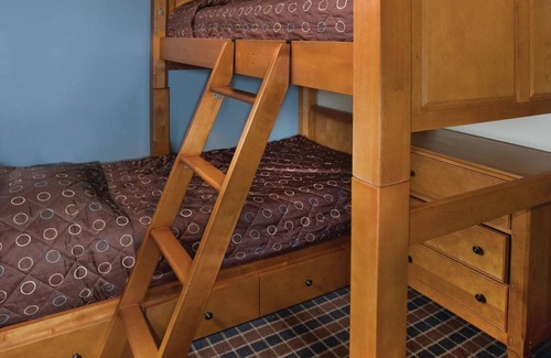 One Bedroom Plus: Queen in master, bunk beds in den, sleeper sofa in living area. Bunk beds are not suitable for adults. Condo has two bathrooms. Maximum occupancy 6.
