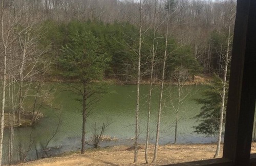 Writers Cabin is located right above the side of the lake. It has a loft with a Queen Bed upstairs and a futon as well. Downstairs there is a kitchen with most utensils and appliances you will need. The living room has a queen full out sofa as well. There is a bathroom with a shower located downstairs. Linens and towels are provided as well as toilet paper, paper towels, hand/dish soap. Outside on the deck you can enjoy the view of the lake while relaxing in the hot tub! 410 acres of hiking trails