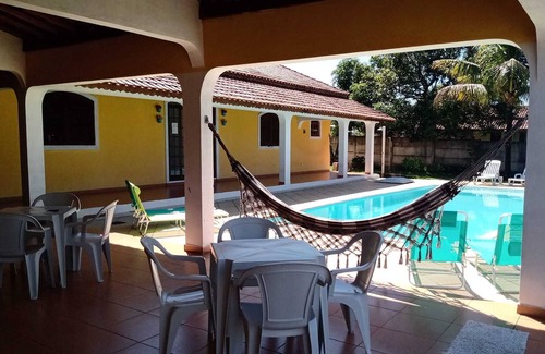 Country house, with 3 bedrooms, two suites, kitchen with all utensils, refrigerator, microwave, stove, freezer, table with 8 chairs, large room with Smart TV, SKY channels / with telecine, wall fans in all rooms and lounge, outdoor leisure area with barbecue, tables and chairs, foosball, large pool, sun loungers. The farm is well located and close to the shopping center.