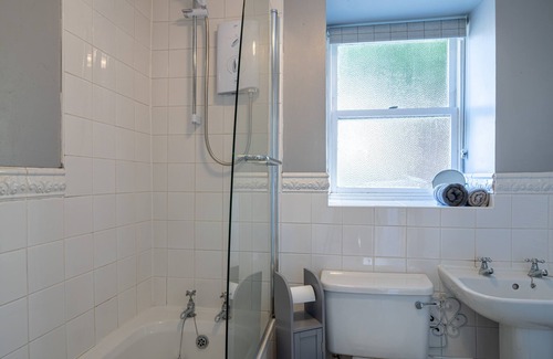 The bathroom is tiled and comprises a bath with an electric shower over, a basin, a toilet and an electrically heated towel rail.