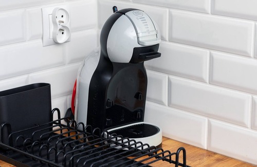fridge with freezer, electric oven, electric kettle, coffee machine (for capsules), toaster, kitchen and tableware